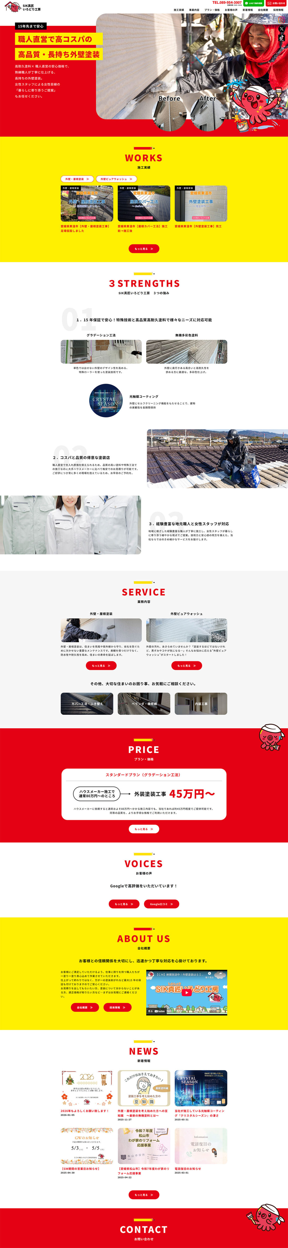 ・ページ構成:トップページ + 下層ページ8 + 投稿ページ(施工実績、新着情報、お客様の声)